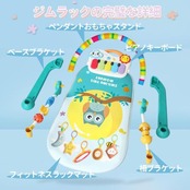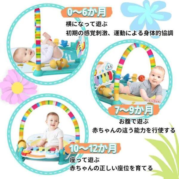 ?【成長過程に合わせて長く使える】:おねんね期(新生児)はジムとして、かわいい仕掛けやミラーなど赤ちゃんの興味を引く手遊びがたっぷり付属。はらばい期(4ヶ月頃)の赤ちゃんは掴む・摘む・引っ張るなどの動きでよりお子様の好奇心をそそります。おすわり期(10ヶ月頃)の赤ちゃんを座って遊んでいます、ピアノ音楽を弾きます。