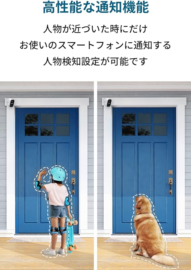 AIカメラ搭載:人の動きを検知し自動で録画を開始するAIカメラを搭載し、細かな動きも逃さずに撮影。夜間や暗い場所などで動きを検知した場合はスポットライトを点灯して、フルカ